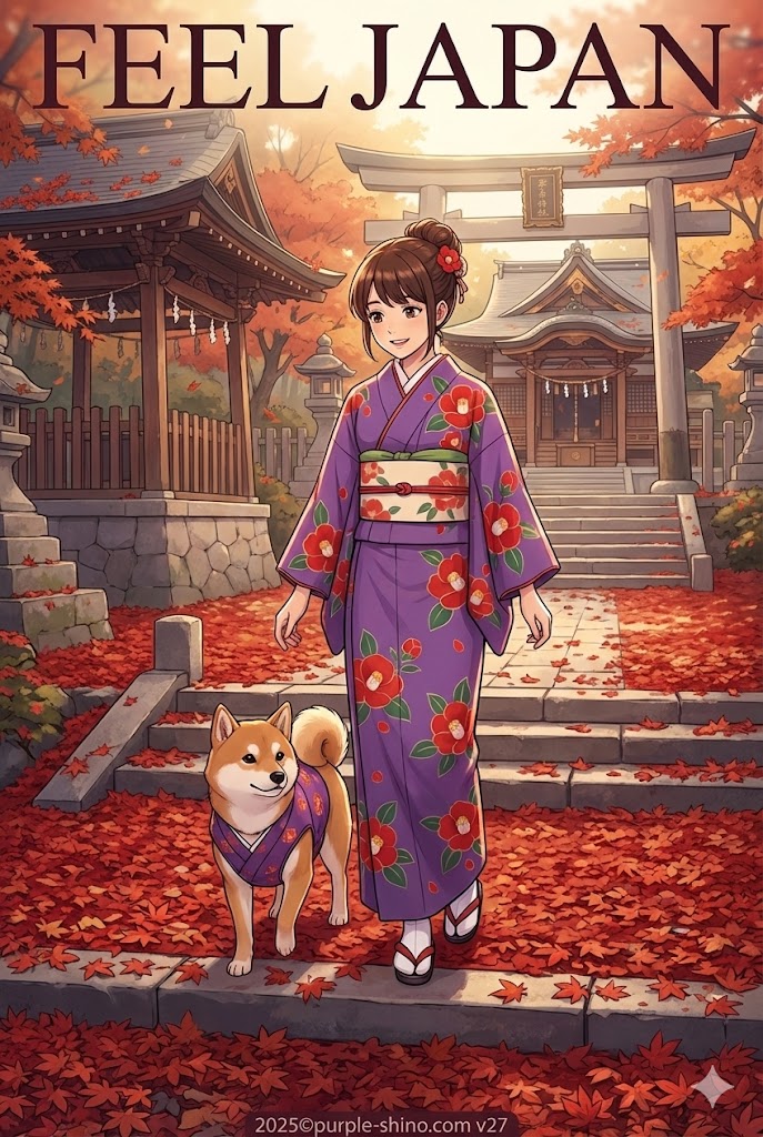 一歩歩くたびに、カサッ、カサッという乾いた音がして、小豆もその感触を楽しんでいるみたい。 今日の私の着物は、これから迎える冬に合わせて「寒椿(かんつばき)」の柄を選んでみました。足元の真っ赤な紅葉と、着物の赤い椿。秋と冬がバトンタッチしているみたいですね。